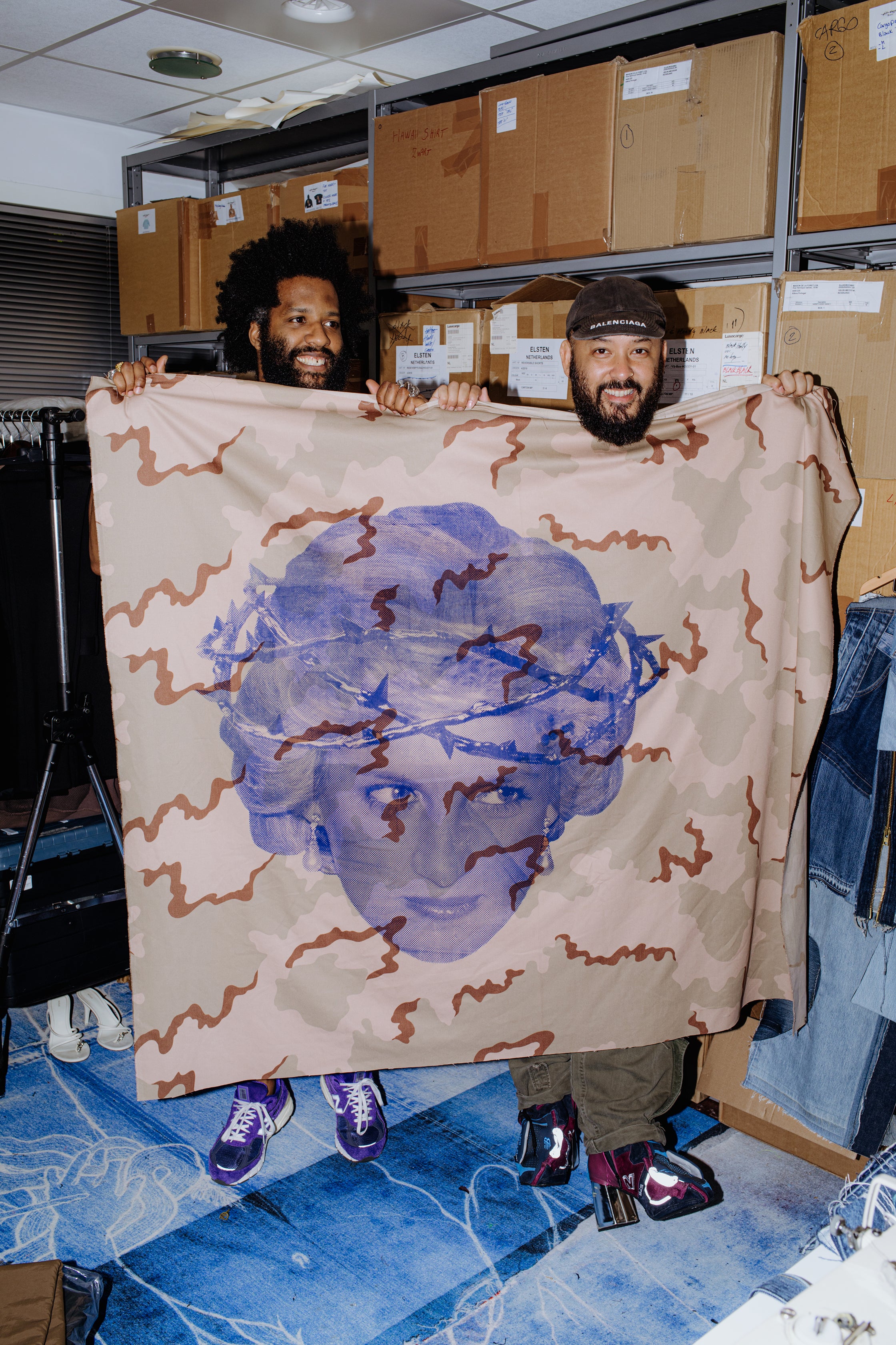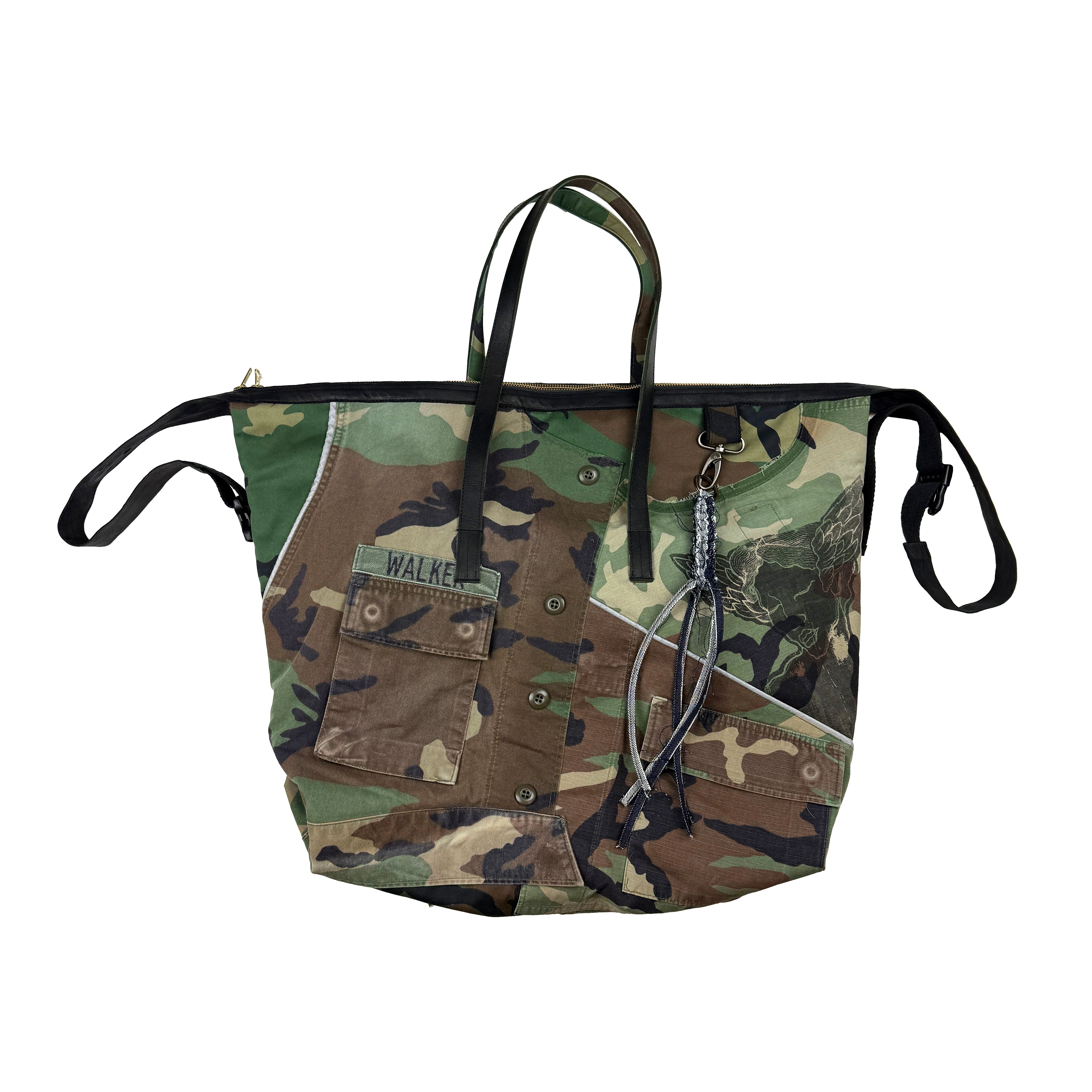 The Atelier Reservé Re-cut Bags are crafted from re-cut dead stock army fabric and cotton twill army pants. Featuring a one-of-a-kind custom screen-printed artwork, each piece is unique. Lightly padded for volume and comfort. Finished with a durable zip closure and detailed with a signature storytelling label. A statement accessory that blends heritage materials with contemporary craftsmanship.