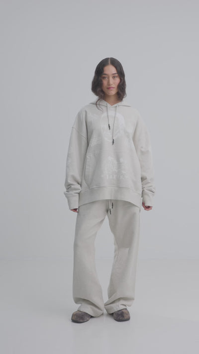 Cut from 480 g Archetype fleece, it offers a soft yet structured drape that feels broken-in from the first wear while holding its shape over time. Dropped shoulders create a relaxed, modern silhouette, and the extra-long drawstring hood with rubber tips adds a subtle streetwear edge. Practical details include a front kangaroo pocket, thumb-hole cuffs for easy layering, and carefully placed graphics for a seamless look.